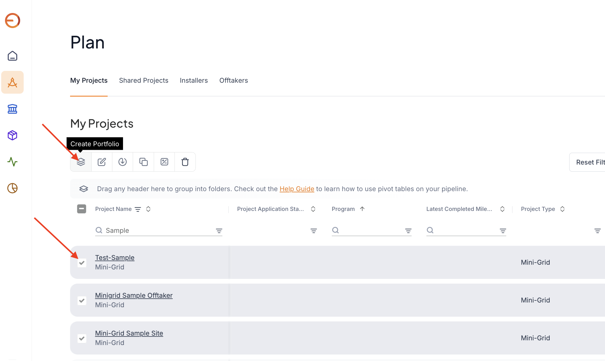 1. Select the projects and select Create Portfolio Once you're ready to seek financing/vendor quotations for your project or group of projects, you can create a portfolio. To create a portfolio, select the checkbox next to the project(s) you want to ...